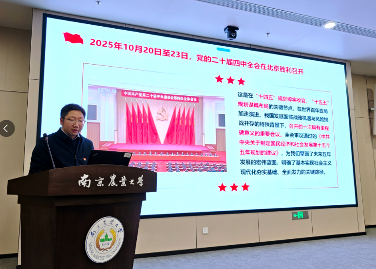 11月10日下午,新校区建设指挥部传达学习党的二十届四中全会精神,党委书记熊富强做了题为“深学细悟党的二十届四中全会精神,凝聚奋进“十五五”新征程磅礴力量”的主题党课。新校区建设指挥部、基本建设处、江浦实验农场全体在职员工、部分离退休党员参加学习,校党委副书记刘营军以普通党员身份参加学习。